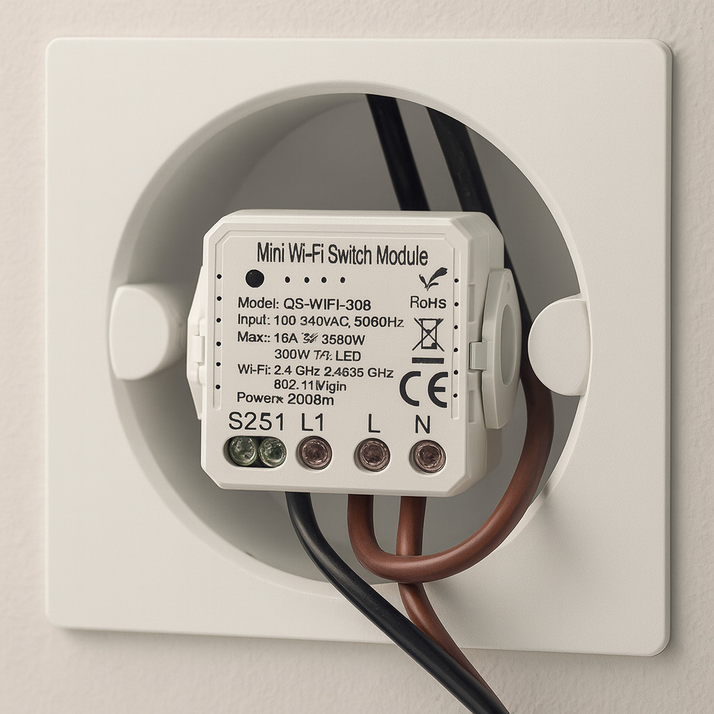 A Tuya WiFi mini okosító arra készült, hogy a meglévő kapcsolóidat vagy dugaljaidat „okossá” tedd úgy, hogy közben a falon semmit ne kelljen lecserélni látványos, új szerelvényre. A modul a kapcsoló/dugalj mögé beépíthető, kompakt mérete miatt pedig sok helyen kényelmesen elfér – a végeredmény egy letisztult, láthatatlan fejlesztés.